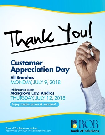 Read MoreMonday, July 9th is Customer Appreciation Day at all BOB branches across The Bahamas with the exception of Mangrove Cay Andros Branch which celebrates on Thursday, July 12th!