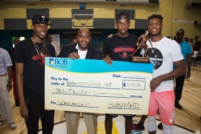 MVP SCHOLARSHIP -- Adam Johnson, MVP of the first Buddy Hield Invitational received a $10,000 scholarship and trophy for his outstanding performance in the game. Pictured from left to right Tamar Pinder, CEO, Mad Events Presents; LaMarque Drew, Manager, BOB's Carmichael Road Branch; Adam Johnson, MVP; and Buddy Hield, NBA Player, New Orleans Pelicans.