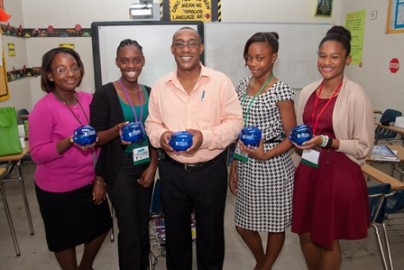 STARTING EARLY --- Kevin Hanna, Manager of BOB’s Treasury Department recently told Junior Achievers that budgeting and saving are absolute priorities for future success and the earlier they start the better it will be for them. Pictured from left: Megan Smith, Junior Achiever; Kazia Pearce, Junior Achiever; Kevin Hanna; Denell Moss, Junior Achiever; and Robyn Allen, Junior Achiever. (Photo by Terrance Strachan)