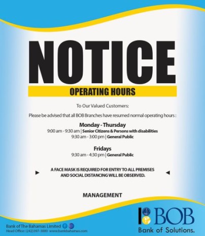Please be advised that all BOB branches have resumed normal operating hours. A mask is required for entry to all premises and social distancing will be observed.