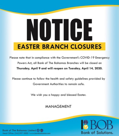 In compliance with the Government's COVID-19 Emergency Powers regulations all BOB branches will close on Thursday, April 9th and reopen at 9:30 am on Tuesday, April 14, 2020.