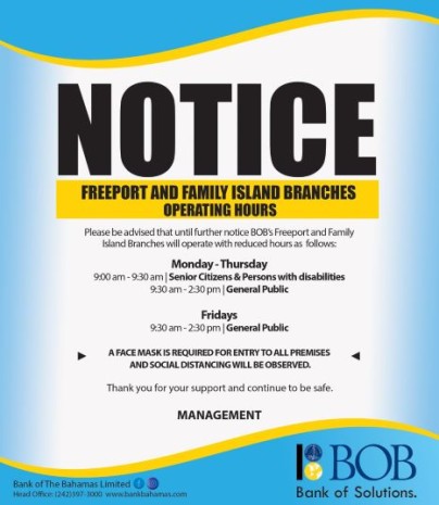 Please note that our Freeport and Family Island Branch hours have changed due to new COVID-19 Emergency Powers regulations. With the exception of Eleuthera Branch, all Family Island branches and Freeport Branch now close at 2:30 pm daily. Please review notice for more details.