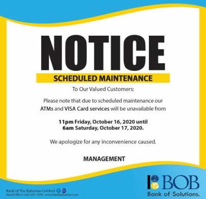 Please note that BOB ATM and VISA Card Services will be unavailable from 11pm Friday, October 16, 2020 until 6am Saturday, October 17, 2020 due to scheudled maintenance.